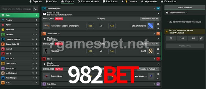 O 982Bet oferece uma grande seleção de opções de apostas em e-sports com probabilidades competitivas